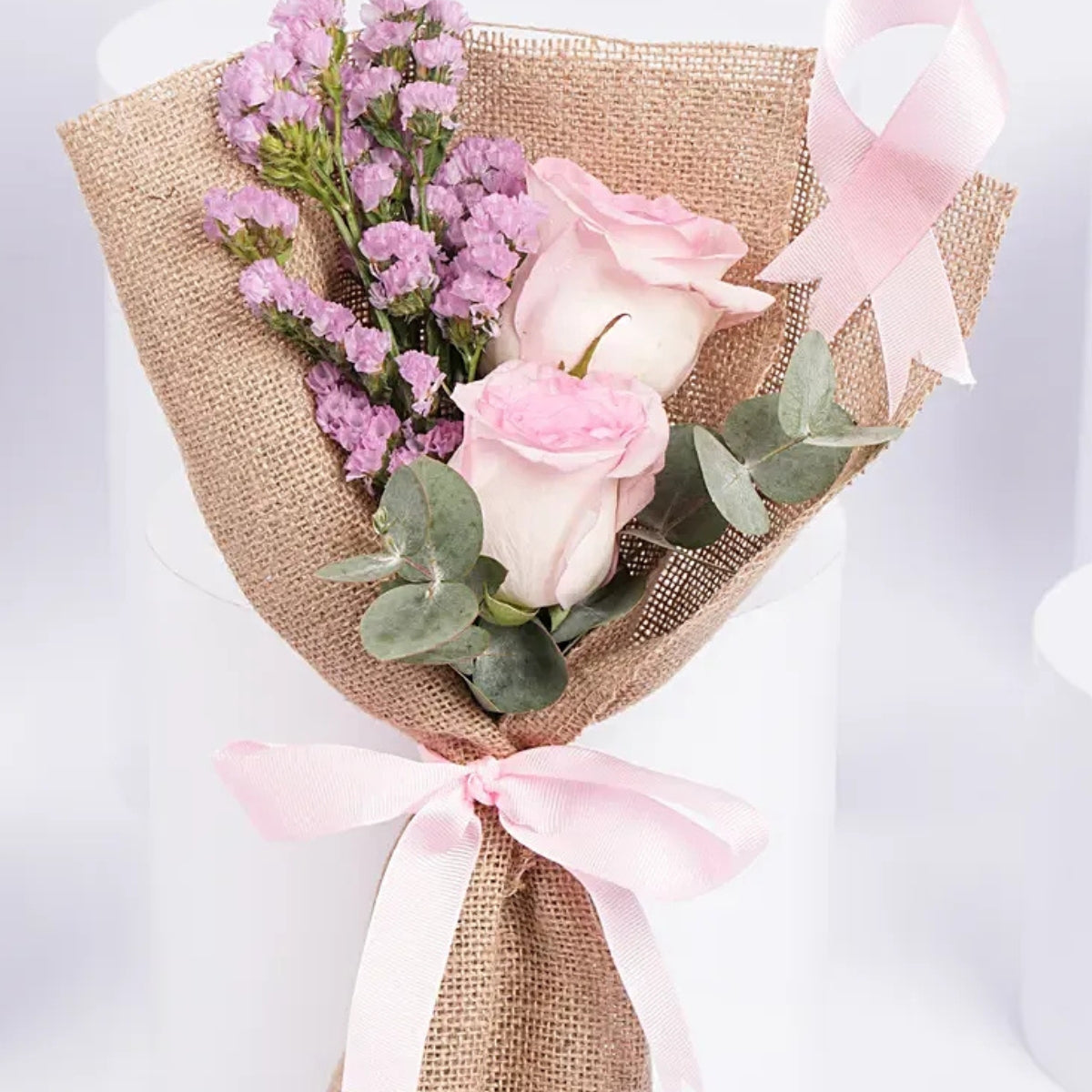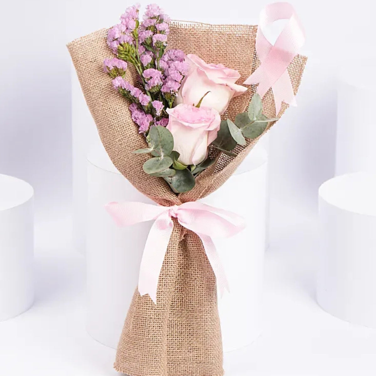 This delicate bouquet wrapped in burlap with a pink ribbon, could tell a story of quiet strength and thoughtful support in the journey of breast cancer awareness.