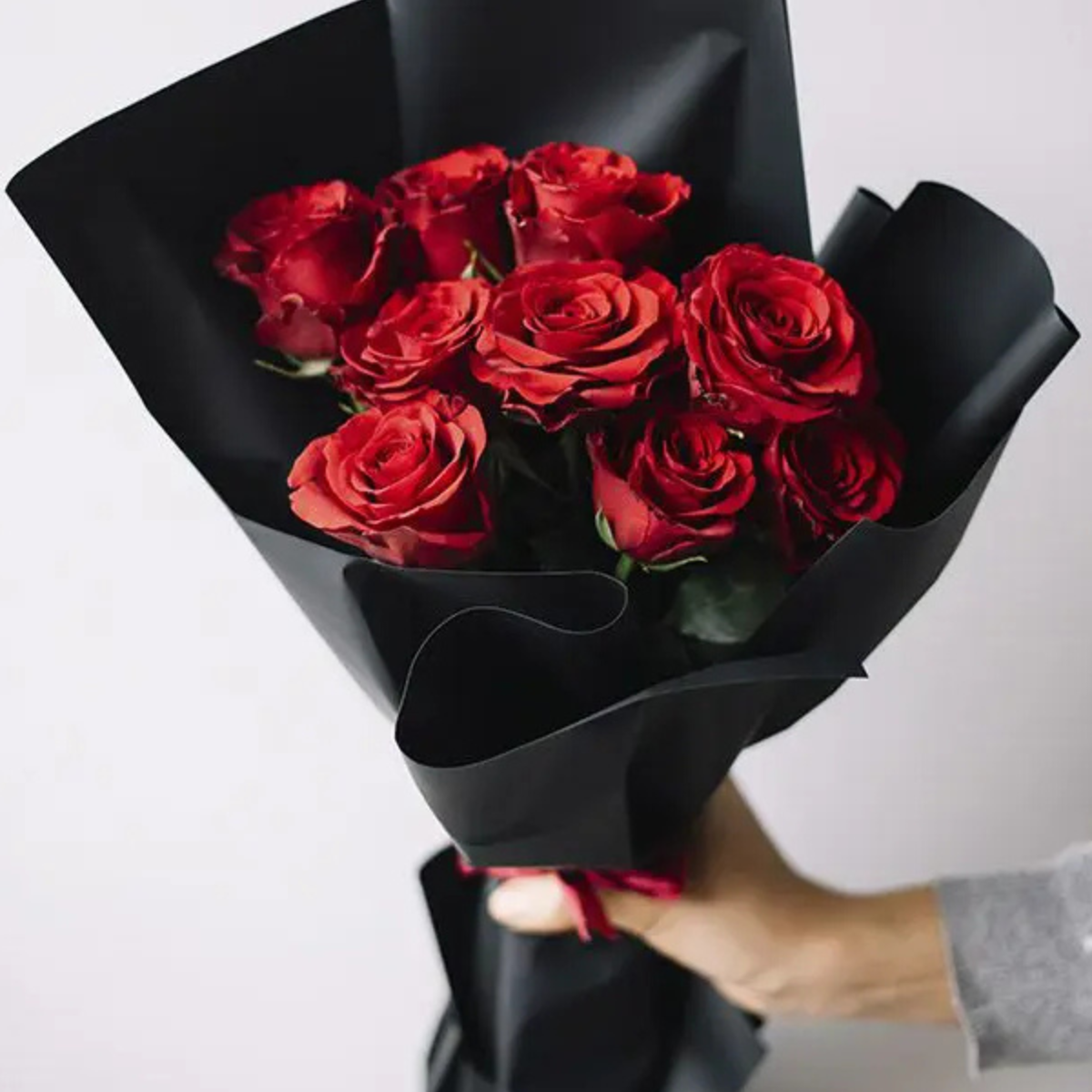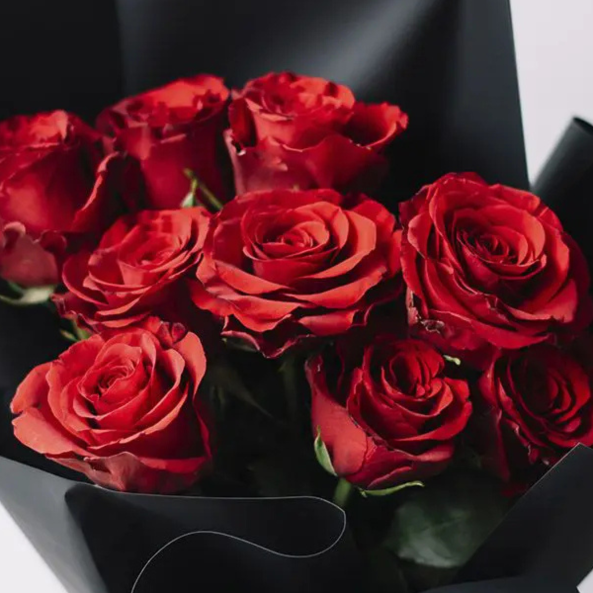 Red Roses defines the Romance we would like to show on, this beautiful hand bouquet made with of 9 Stems Red Roses in a black wrapping.