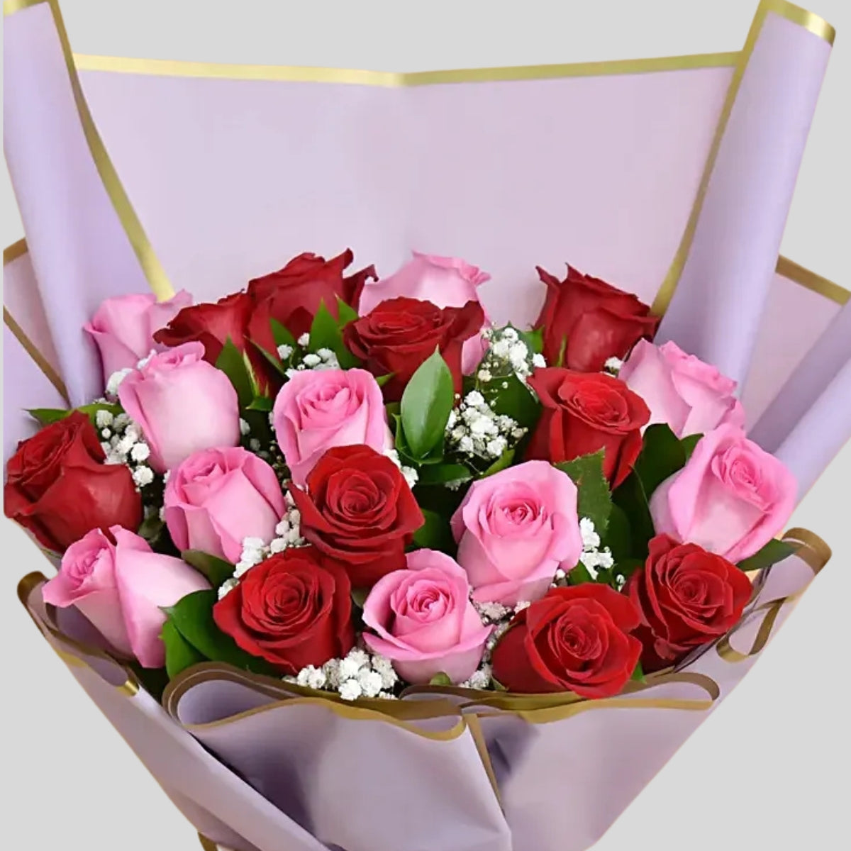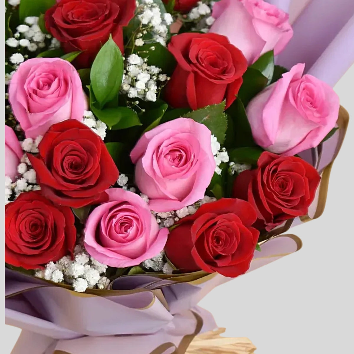 Expertly wrapped and tied with jute thread, this bouquet captures the essence of affection. Fresh roses of red and pink come together in a passionate display of beauty.