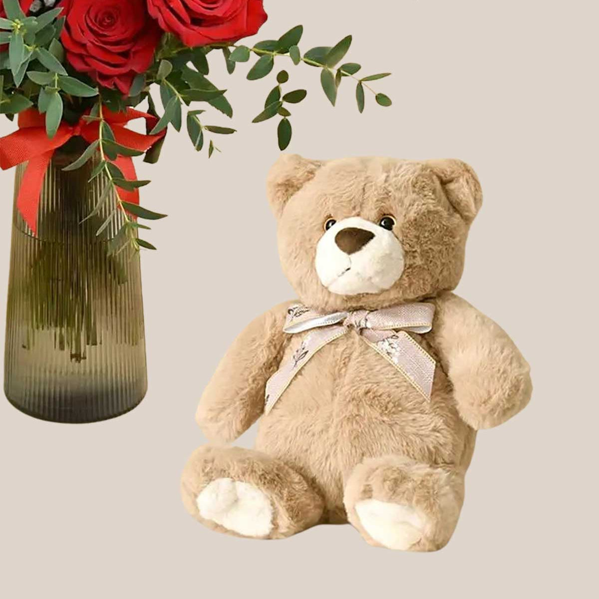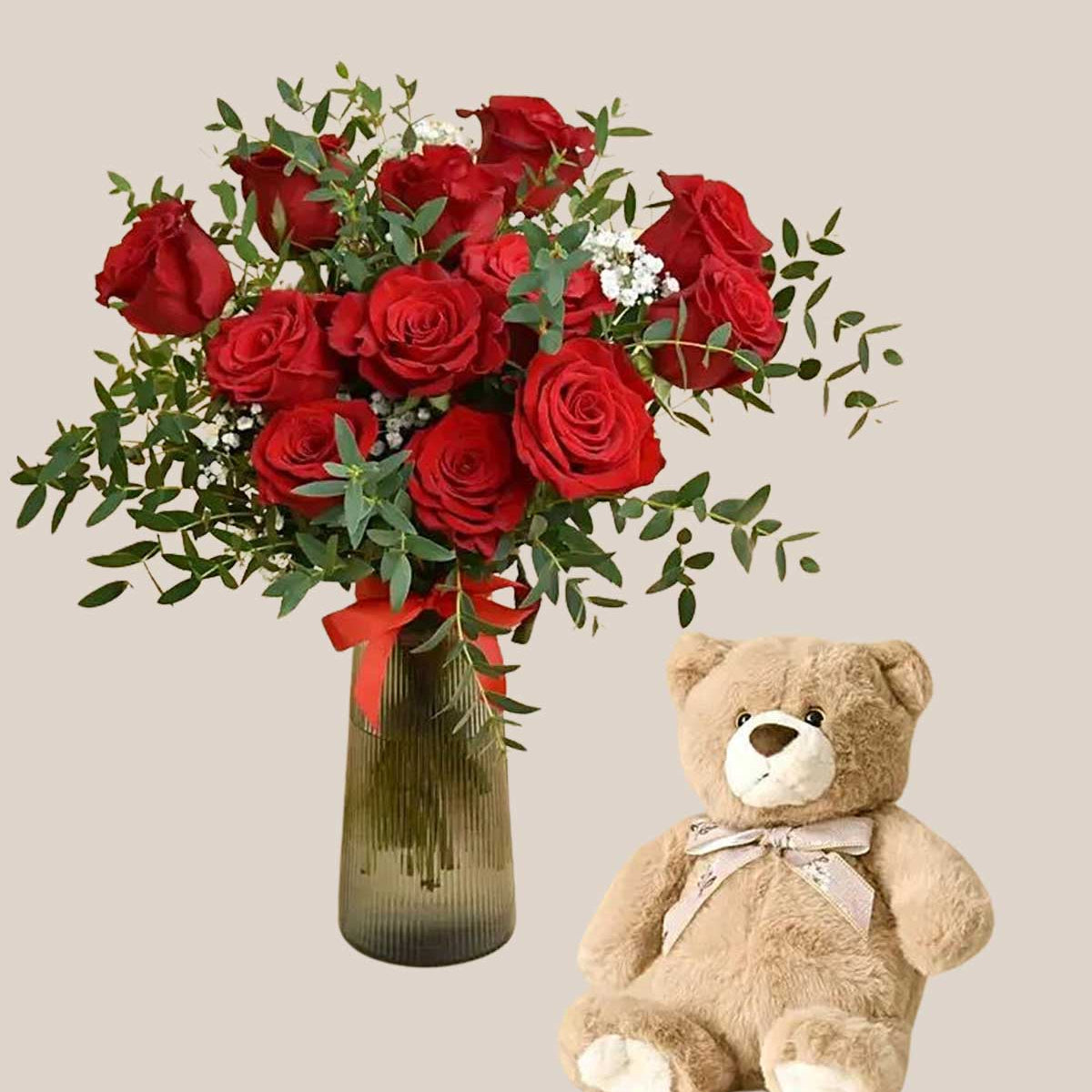12 Red Roses in Premium Vase And Teddy