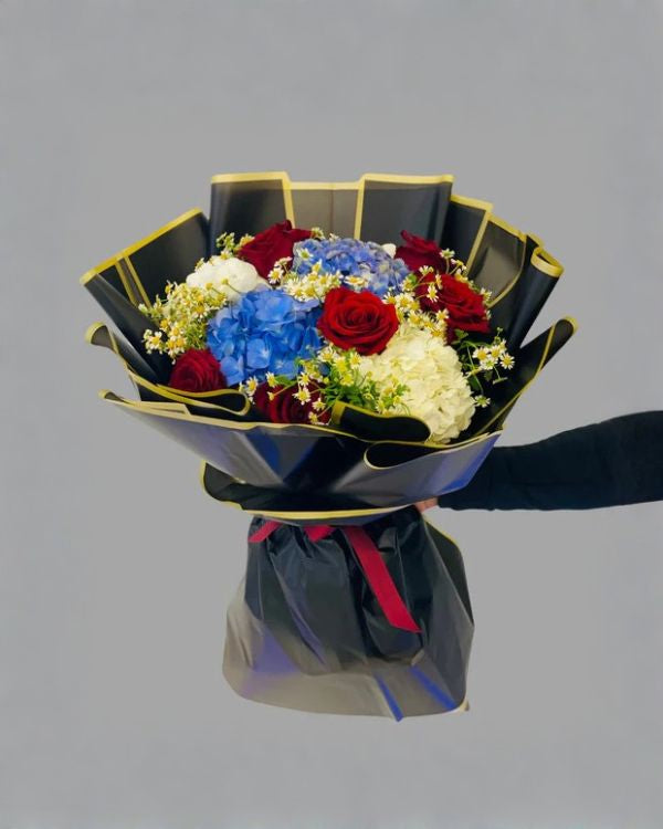 Blue’s Chamomile bouquet – hydrangea and roses - Peta Frost Dubai