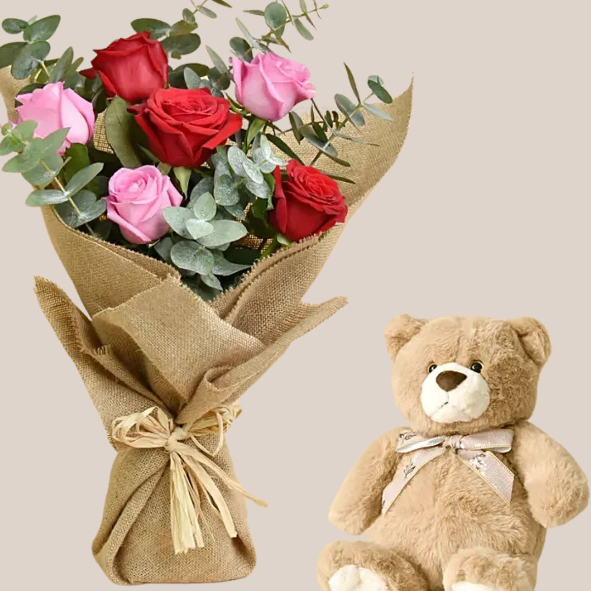 The vibrant roses with the cuddle-worthy teddy bear is how you confess your love to that special someone. Hand-selected roses are arranged perfectly to surround them with a sweet perfumey smell. The teddy bear is a cute addition to show your deep emotions.