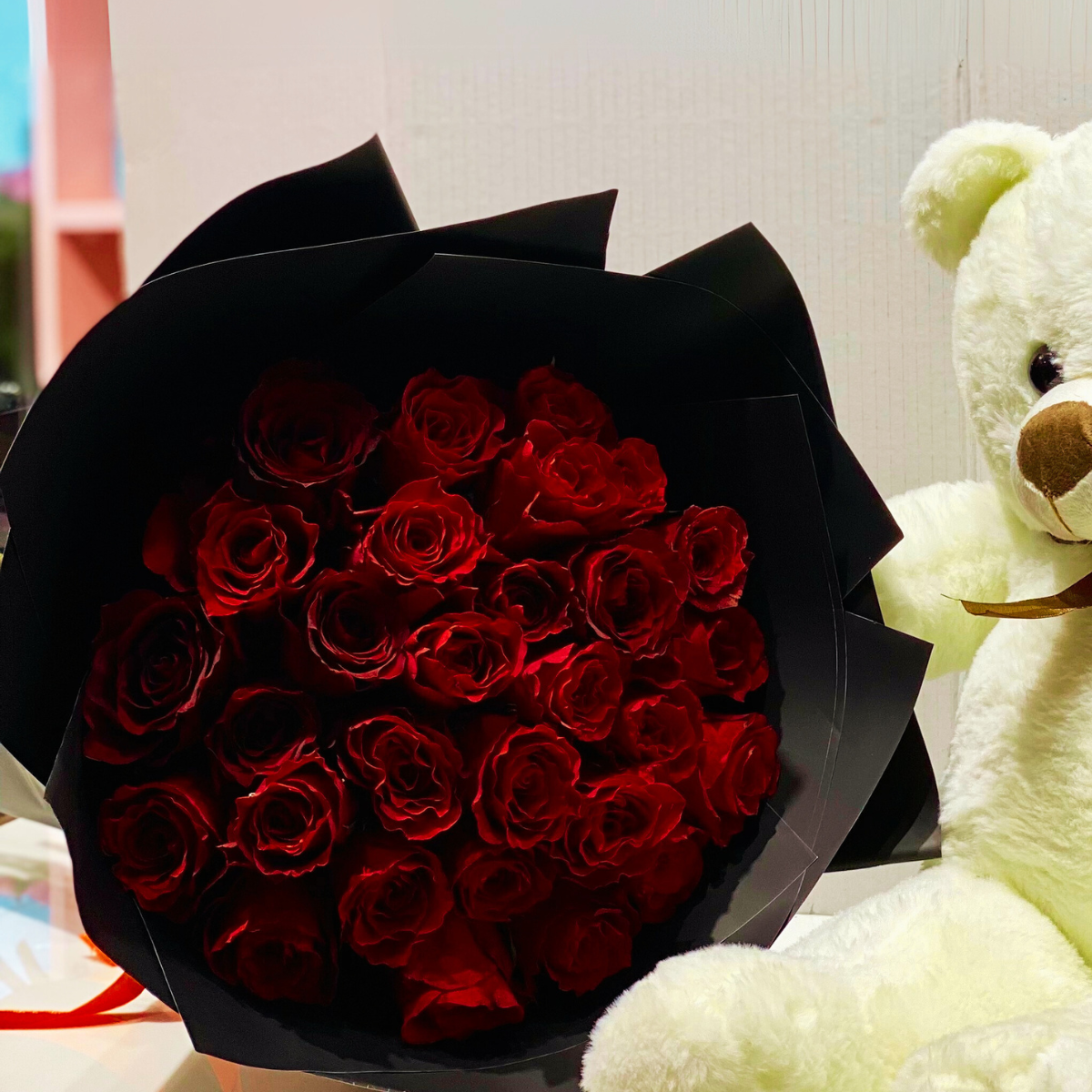 This luxurious arrangement features thirty handpicked, premium red roses—symbolizing love, passion, and devotion—paired with a soft, cuddly teddy bear for the perfect romantic touch.