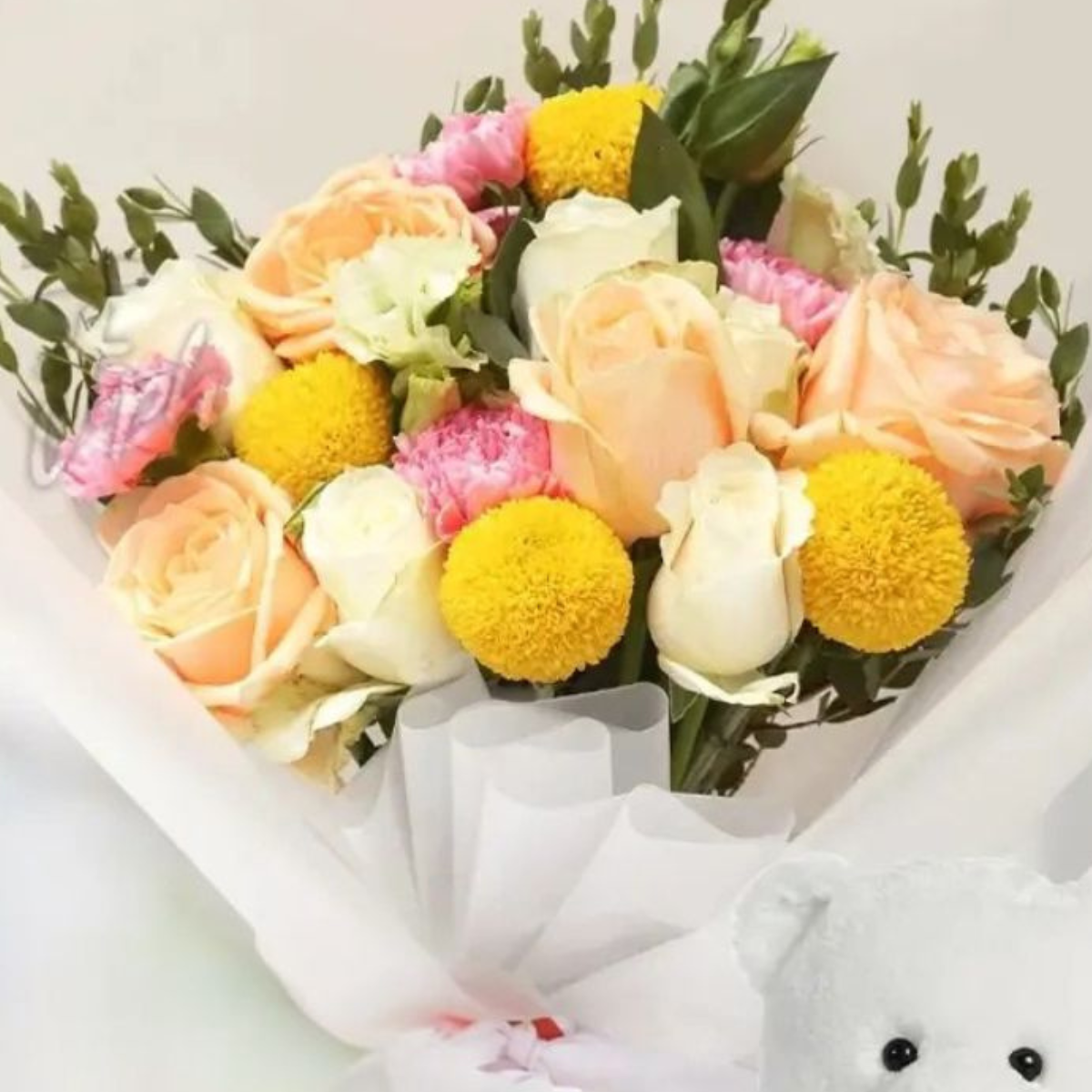 - Rose Bouquet: 4 stems of Peach Roses, 4 stems of White Roses with 4 stems of Pink Carnations and 3 stems of Yellow pompom with green fillers