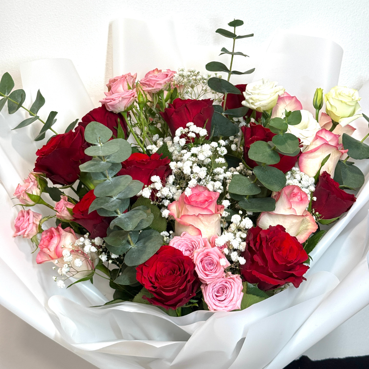 Featuring vibrant red roses paired with soft pink blooms, elegant spray roses, lisianthus, eucalyptus, and gypsophila, this bouquet is designed to symbolize love, admiration, and grace.