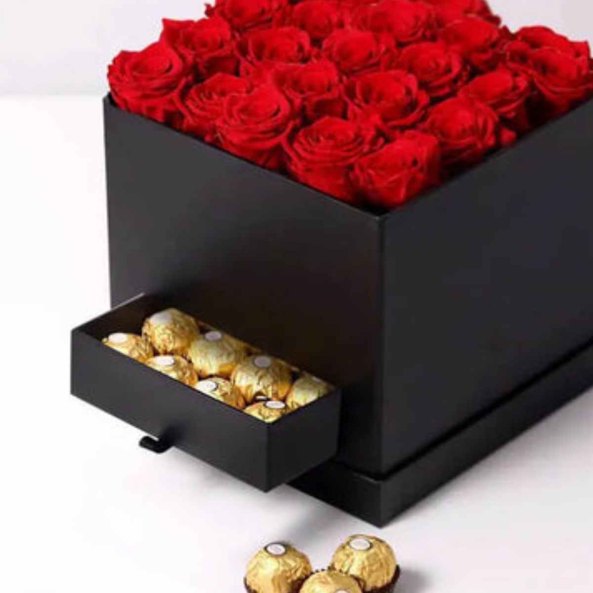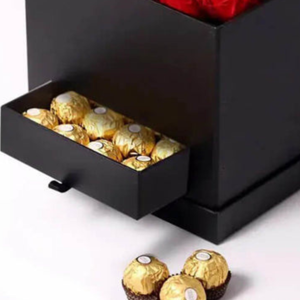 Red Romance - Valentine's Special is the perfect gift for your loved ones. This stunning flower box arrangement features fresh red roses beautifully arranged in a square black box, creating a striking contrast of colors. To add a touch of sweetness, the arrangement also includes 12 pieces of Ferrero Rocher chocolates. It's a gift that combines the beauty of flowers with the indulgence of chocolates, making it a truly romantic gesture.