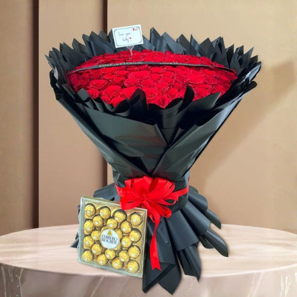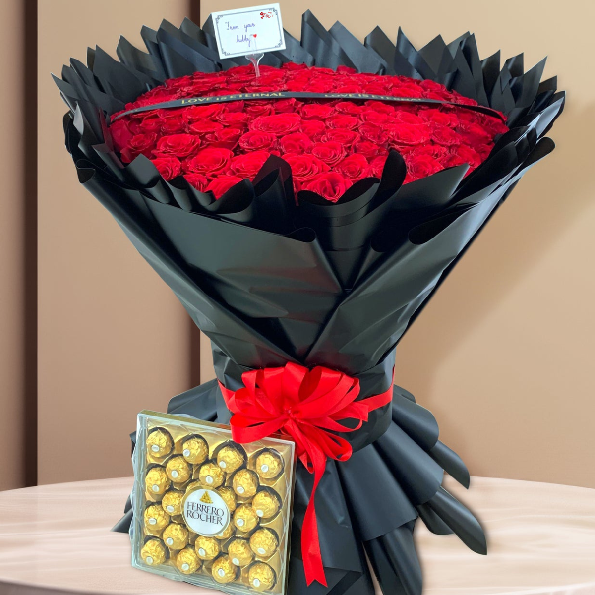 "Experience the ultimate gesture of love with the *Romance of 101 Red Roses with Ferrero Rocher Chocolate Bouquet*. This magnificent bouquet features 101 lush red roses, each symbolizing deep affection and unwavering passion. Nestled within the blooms are delectable Ferrero Rocher chocolates, adding a sweet touch to the romantic display. Perfect for celebrating love, anniversaries, or special moments, this opulent gift combines elegance and indulgence, creating an unforgettable experience for your loved one.
