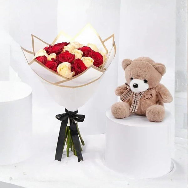 Celebrate love with the Elegant Duo of Roses Valentine’s Bouquet with Teddy Bear from Petal Frost’s flower shop in Dubai.