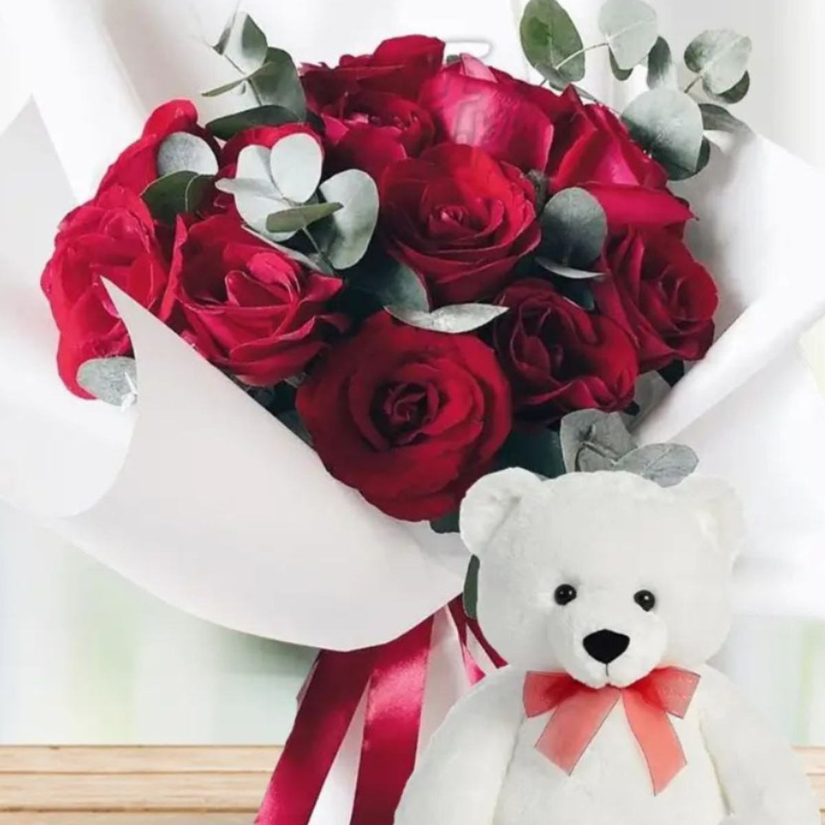 Featuring a stunning bouquet of fresh red roses with lush eucalyptus and green fillers, paired with a soft, cuddly teddy bear, this thoughtful combo is perfect for Valentine’s Day, anniversaries, or any special surprise.