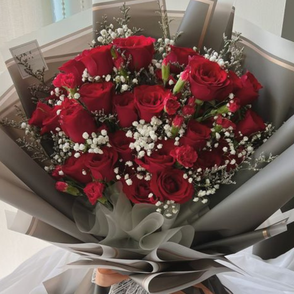 Featuring 25 premium red roses arranged with fresh eucalyptus and elegantly double-wrapped with a golden ribbon, this bouquet captures the quiet beauty of romance.